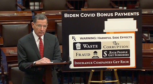 WASHINGTON, D.C. – U.S. Senator John Barrasso (R-Wyo.), Senate Majority Whip, today spoke on the Senate Floor blasting the Democrats’ $83 billion plan to extend the Biden COVID Bonus Payments directly to insurance companies without any reforms.